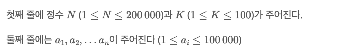 이하의 양의 정수로 이루어진 길이가 인 수열이 주어진다. 이 수열에서 같은 정수를 개 이하로 포함한 최장 연속 부분 수열의 길이를 구하는 프로그램을 작성해보자.