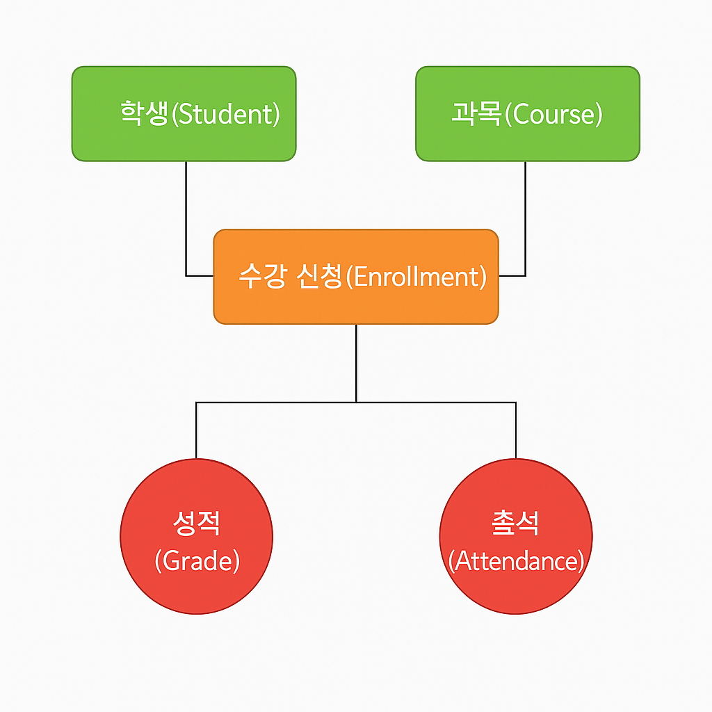 학생이란 엔터티(기본엔터티1)와 과목이란 엔터티(기본엔터티2)와 수강신청(중심엔터티)은 연관되어있다. 그리고, 이 수강신청의 엔터티를 통해 성적(행위엔터티), 출석(행위 엔터티)이란 엔터티가 발생한다. 한 학생의 수강 신청 이력에서 성적이 산출되고, 그 수강신청한 것에 대해서 출석 또한 관리되기 때문이다.