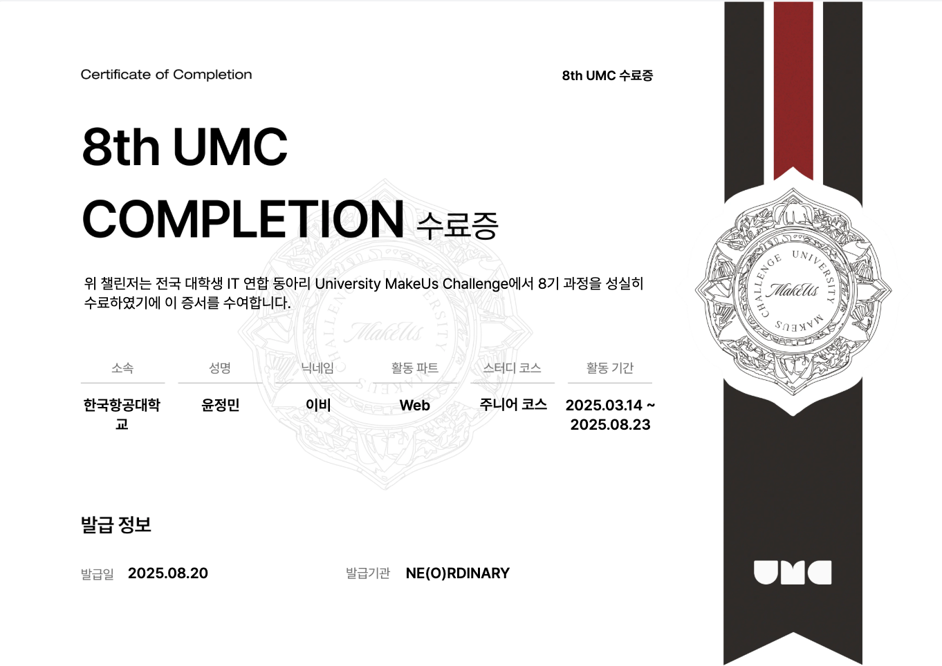 2학년 1학기 때, 전공 수업만으로는 제 경험과 지식이 부족하다고 느껴 IT 동아리를 찾던 중 친구가 UMC라는 동아리를 소개해 주었다. 당시 UMC는 6기였고, 그 친구는 항공대 6기 회장이었다. 그렇게 나는 처음으로 Node.js 파트를 접하며 활동을 시작했고, 우여곡절 끝에 수료를 마쳤다.