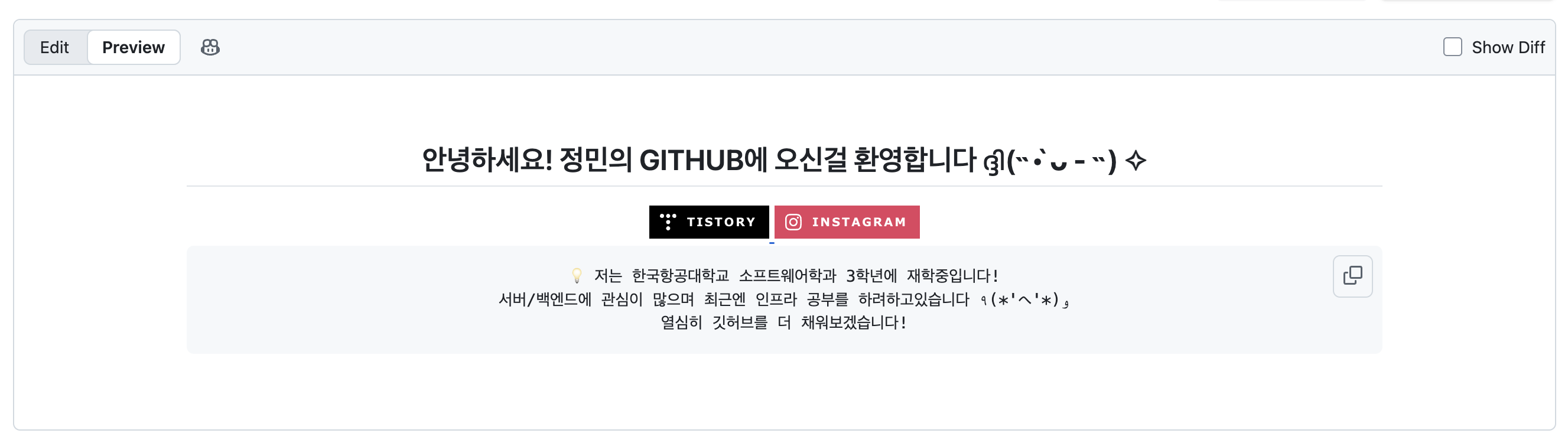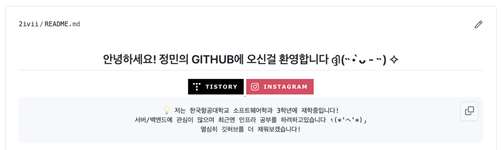 우선, 내 깃허브 리드미 코드를 보면 알겠지만 나는 크게 div 세개로 나누어서 꾸며놨다. 첫번째 두번째 div에는 바로 위의 사진과 같이 내 깃허브를 소개하는 오프닝 멘트를 담고있다.