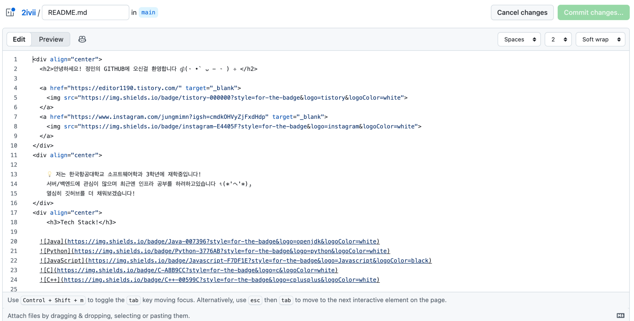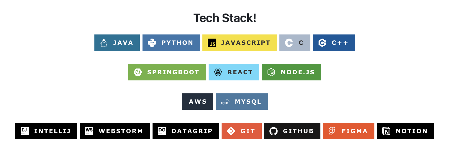 나는 언어, 프레임워크, 툴 이런식으로 공통된것들끼리 한줄에 배치했다. 저렇게 사이사이 줄을 띄우면 줄바꿈 되니까 참고하기!