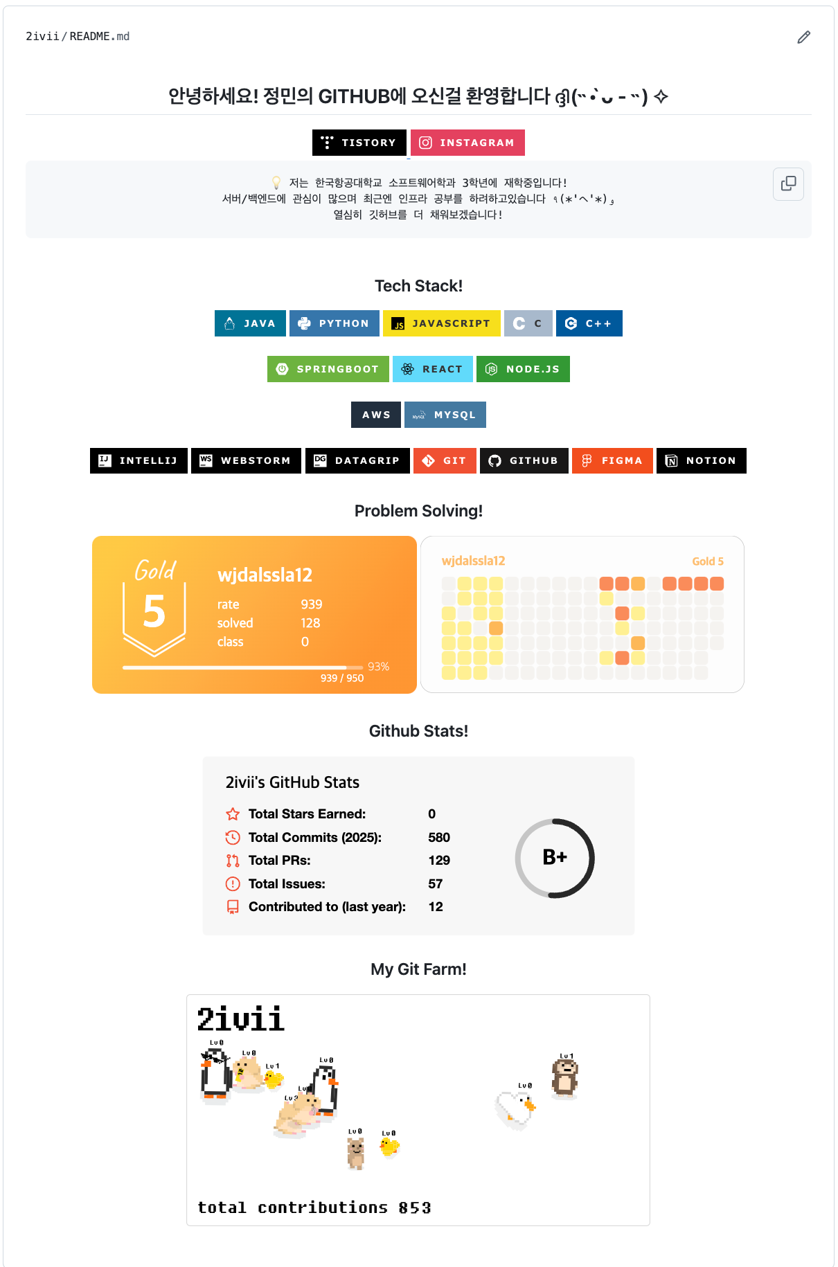 Tech Stack, Problem Solving!, Github Stats!, My Git Farm! 이렇게 네 종류가 있는 것을 알 수 있다. 각각 설명해주겠다!